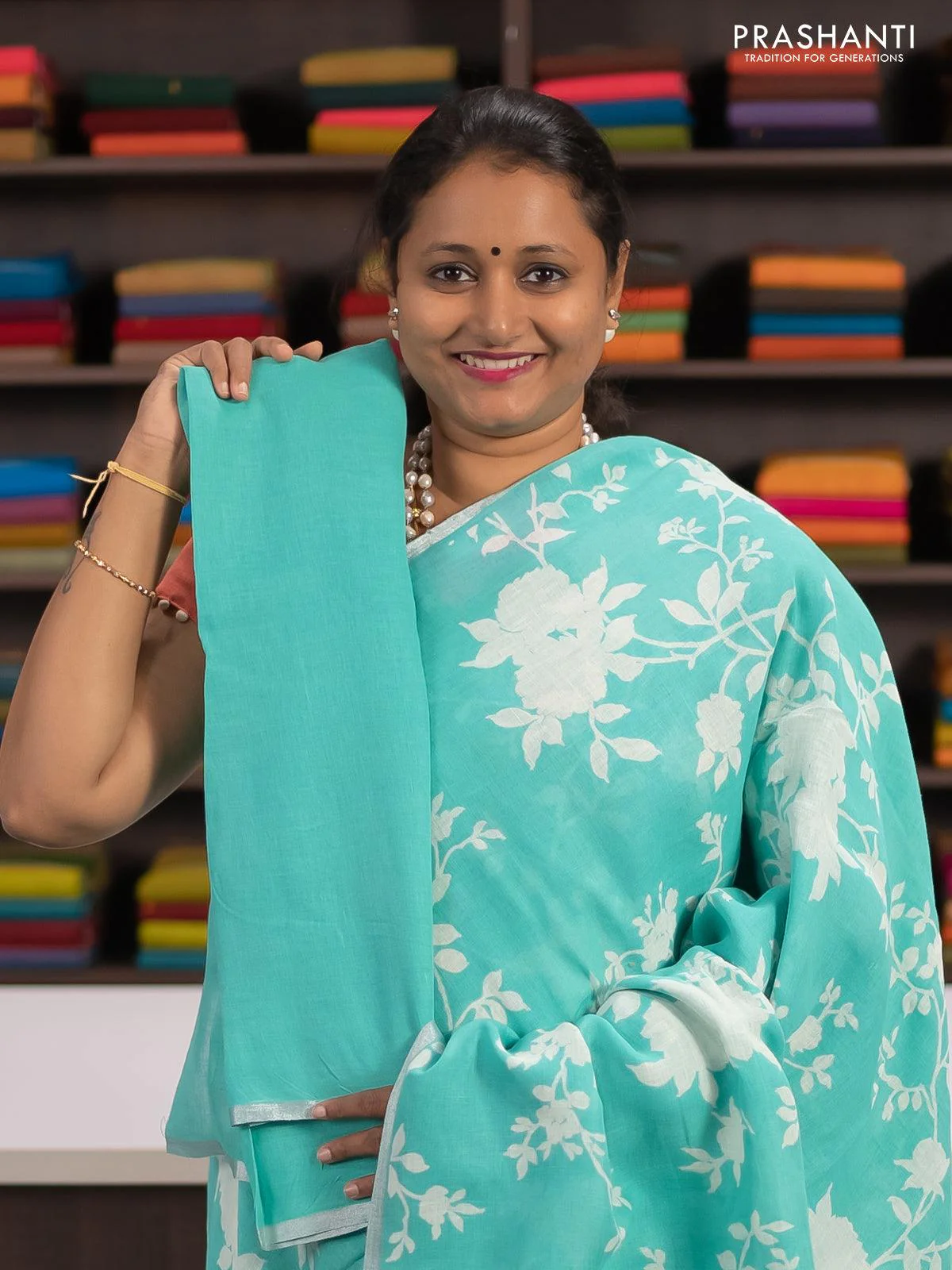 Linen cotton saree teal blue with allover floral prints and small silver zari woven border