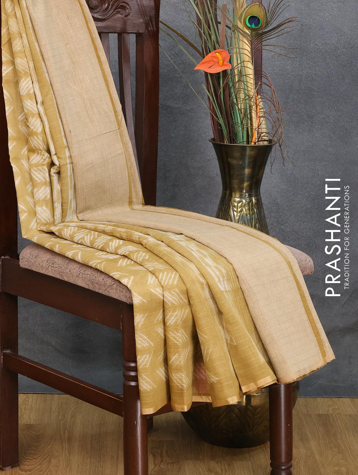 Maheshwari silk cotton saree khaki shade with allover butta prints and zari woven piping border