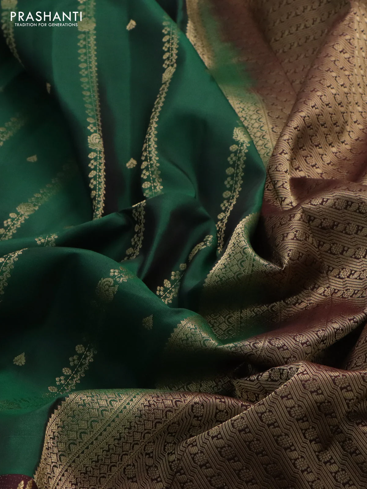 Pure kanchipuram silk saree green and deep maroon with allover zari weaves & buttas and long temple deign rettapet zari woven border