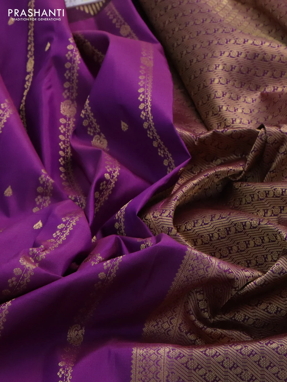 Pure kanchipuram silk saree mild purple and purple with allover zari weaves & buttas and long temple deign rettapet zari woven border