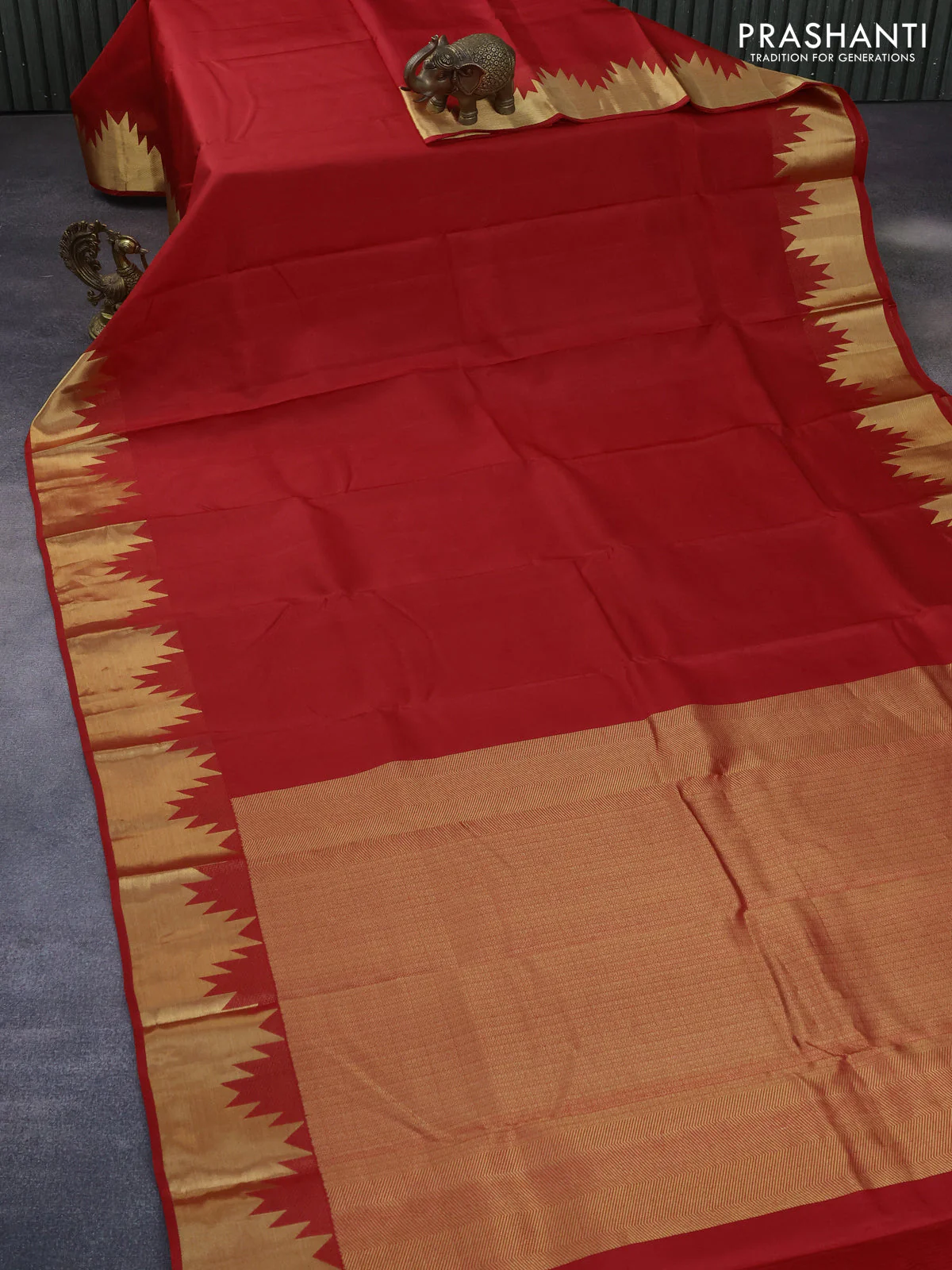 Pure kanchipuram silk saree red with plain body and temple deisgn zari woven border