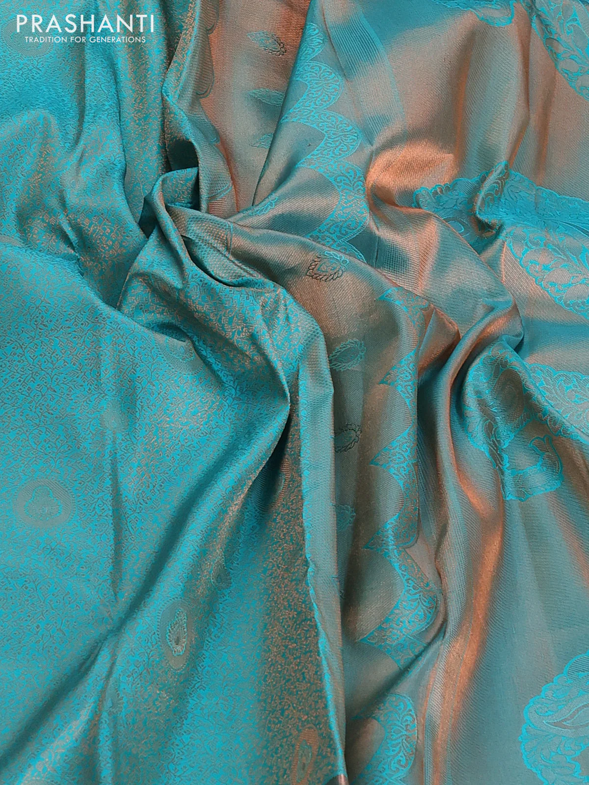 Pure kanchipuram silk saree teal blue shade with allover copper zari wevaes and copper zari woven border