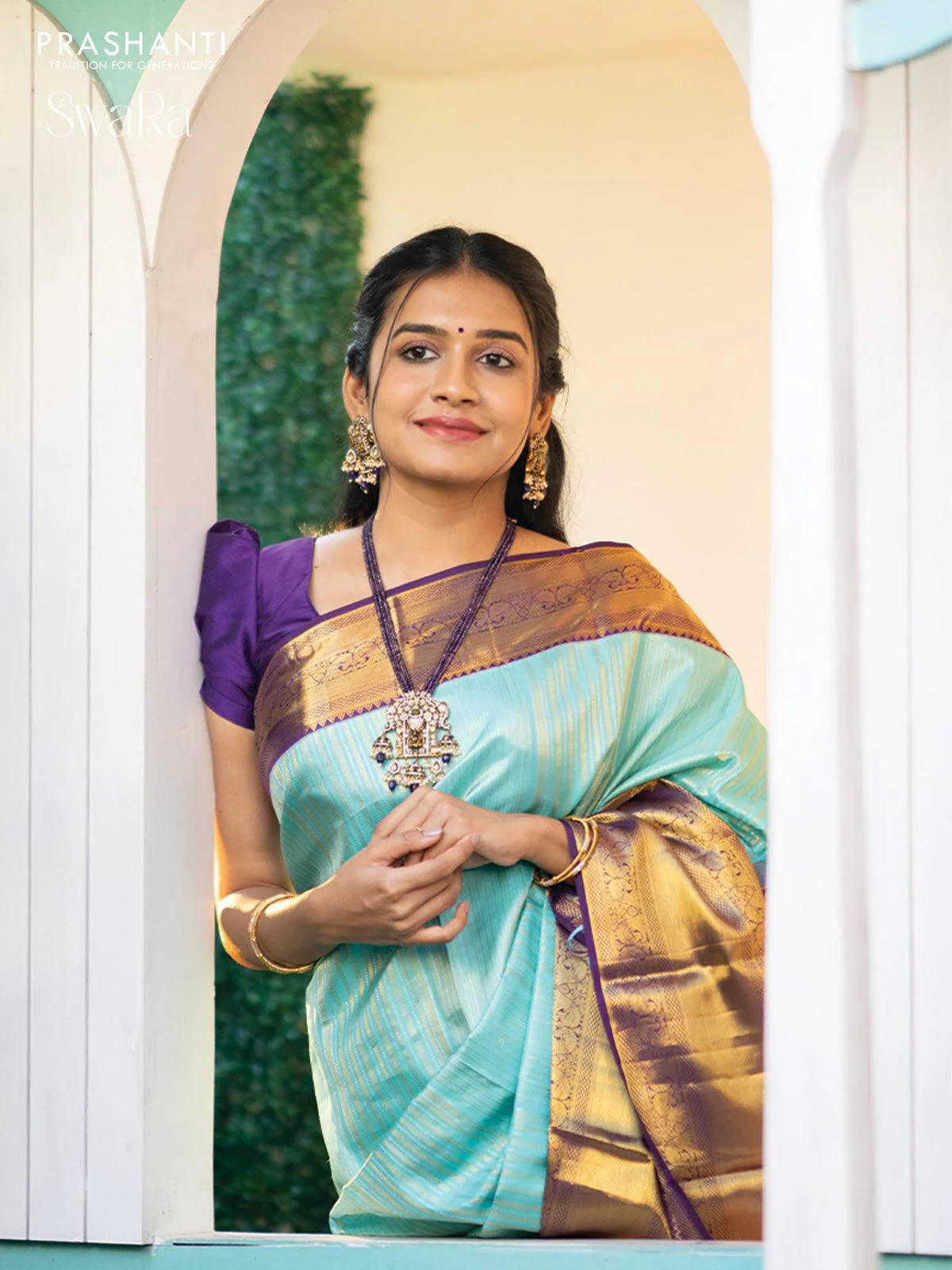 Pure kanjivaram silk saree light blue and violet with allover silver & gold zari weaves and long zari woven border