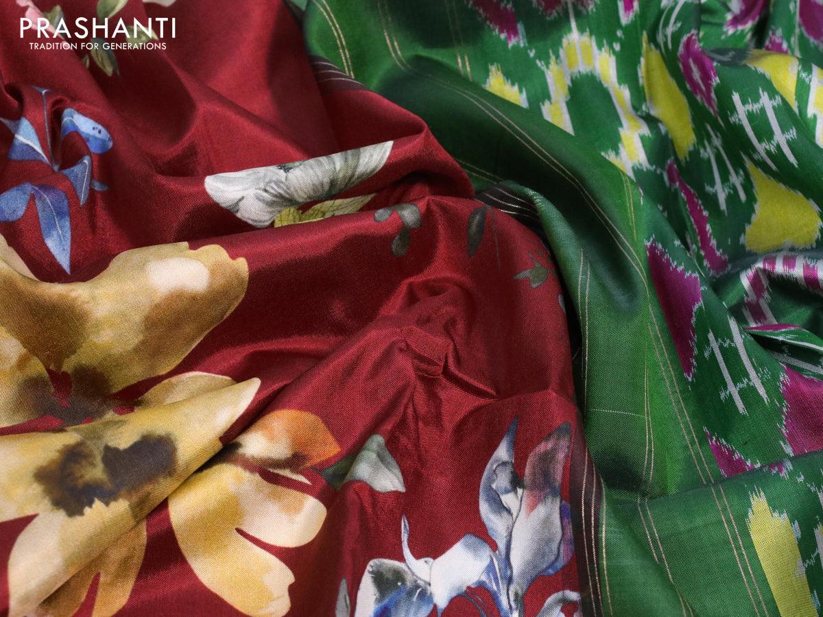 Pure kanjivaram silk saree maroon and green with allover floral digital prints and annam zari woven border