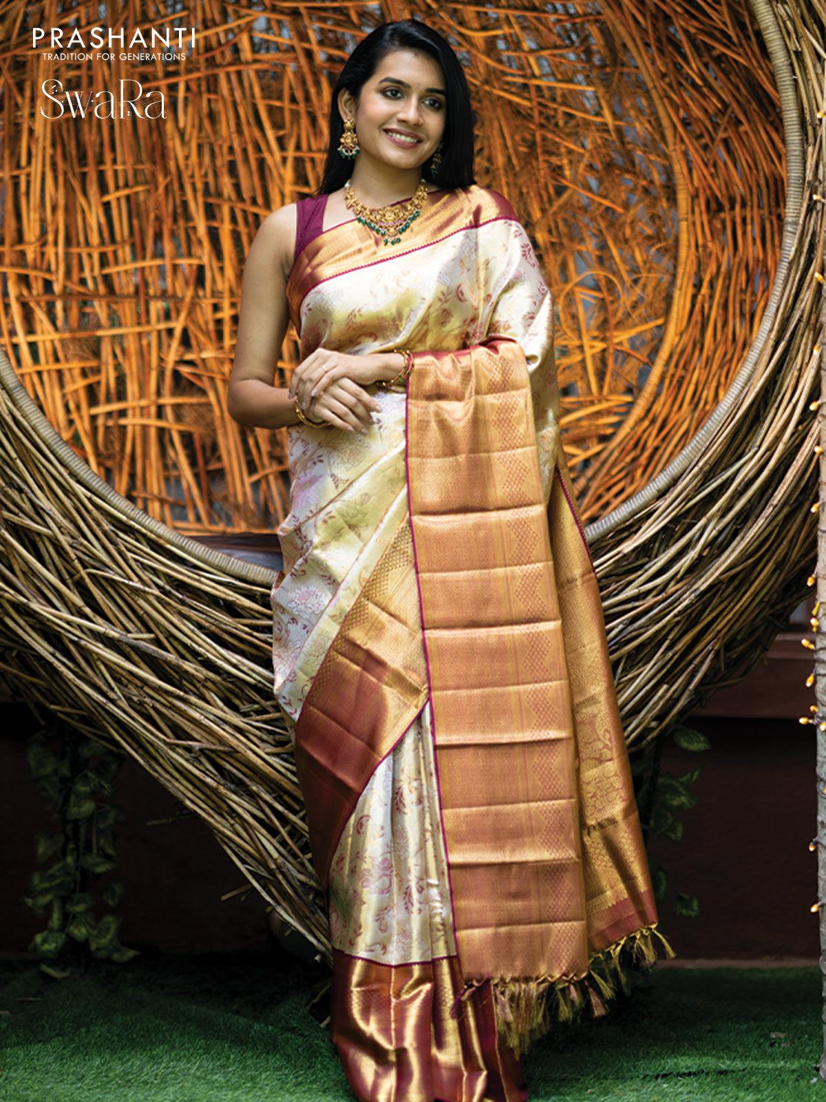 Pure kanjivaram tissue silk saree gold and dark magenta pink with allover zari woven brocade weaves and zari woven border