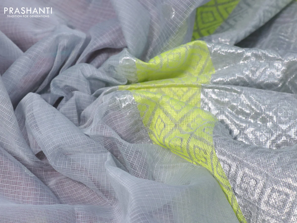 -70%Pure zari kota silk saree grey and maroon with thread & zari woven floral buttas and silver zari woven simple border—