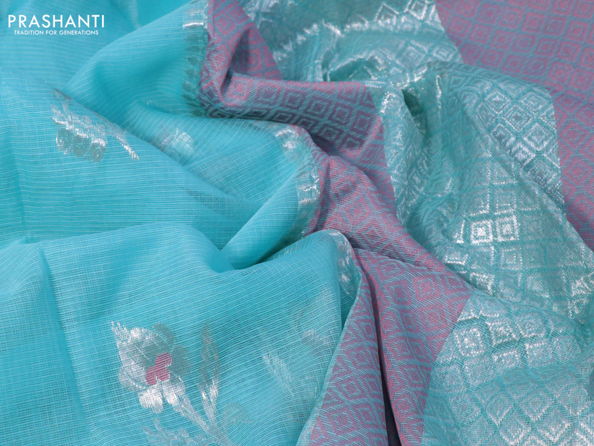 Pure zari kota silk saree light blue and pink with thread & silver zari woven buttas and silver zari woven simple border