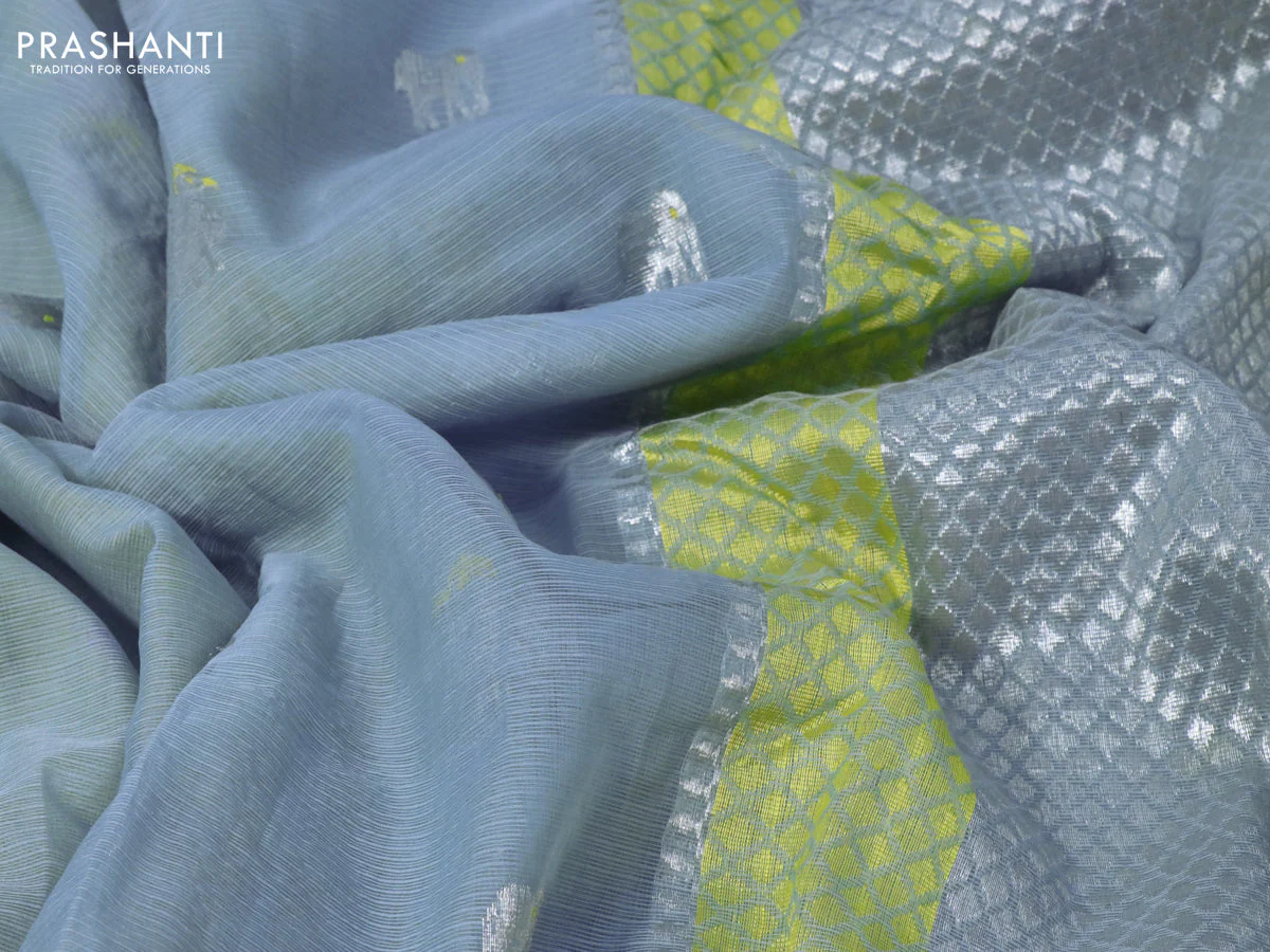 Pure zari kota silk saree light blue and yellow with silver zari woven buttas and silver zari woven border