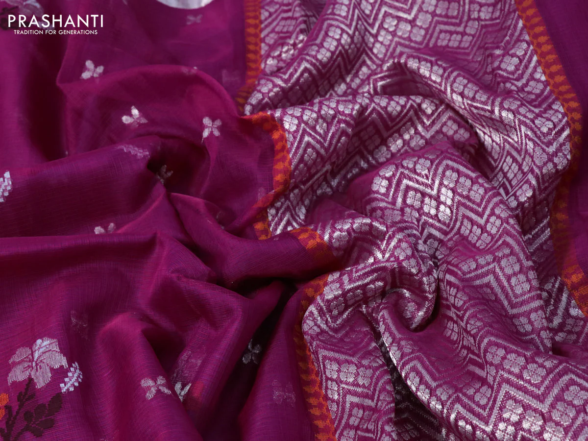 -70%Pure zari kota silk saree magenta pink and blue with thread & silver zari woven floral buttas and silver zari woven border—