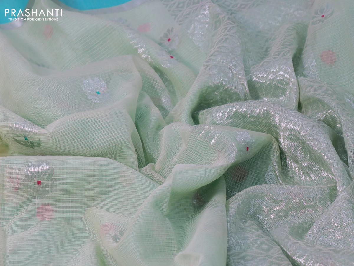 Pure zari kota silk saree pastel green and teal blue with silver zari woven buttas and silver zari woven simple border