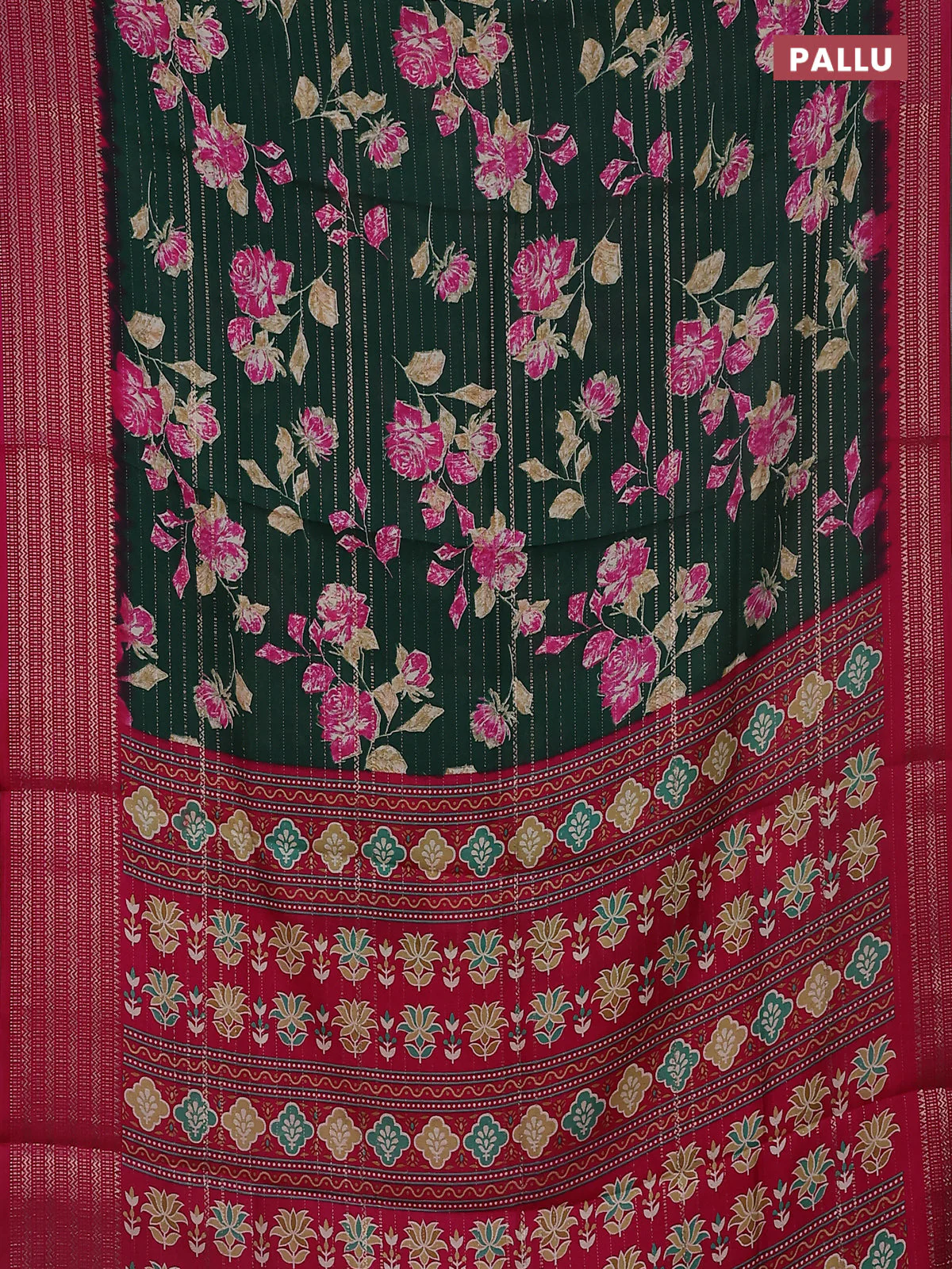 Semi dola saree dark green and pink with allover zari weaves & floral prints and zari woven border